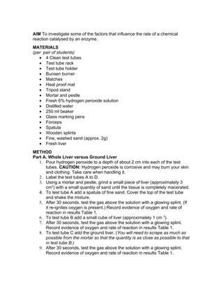1. The experiment investigated factors that influence the rate of a chemical reaction catalyzed by the enzyme catalase. Liver tissue and hydrogen peroxide were used to test the effects of grinding, temperature, and controls.