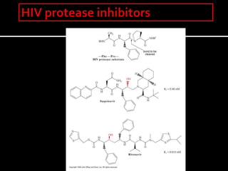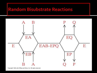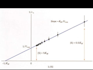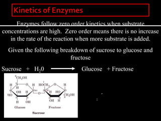 This document discusses enzyme kinetics and inhibition. It notes that enzymes follow zero-order kinetics at high substrate concentrations, meaning the reaction rate does not increase with more substrate. It then describes Michaelis-Menten kinetics using the rate equation and defines terms like KM and Vmax. KM is the substrate concentration at half the maximum rate and is a measure of substrate affinity. Different types of inhibition are also summarized, including competitive, uncompetitive, and mixed inhibition and how they affect the Michaelis-Menten equation and Lineweaver-Burk plots.