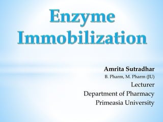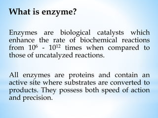 Enzymes are biological catalysts that are proteins and greatly increase the rate of biochemical reactions. They contain an active site that converts substrates to products. Enzymes accelerate reactions by lowering the activation energy required for substrates to reach the transition state. This is achieved through the enzyme-substrate complex. Immobilizing enzymes makes them reusable and more stable while reducing costs. Common immobilization methods include entrapment in a polymer matrix, microencapsulation, adsorption, covalent binding, and cross-linking to a support. Enzyme applications include medical, analytical, manipulative, and industrial uses.