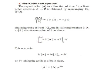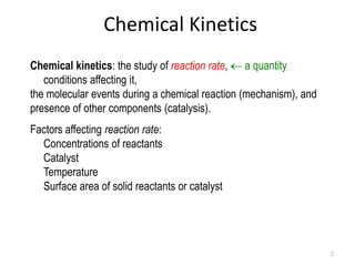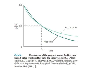 This document discusses enzyme kinetics and the Michaelis-Menten model of enzyme kinetics. It defines key terms like reaction rate, elementary reactions, rate laws, and transition state theory. It then introduces the Michaelis-Menten equation, defines terms like Km, Vmax, and kcat. It discusses steady state kinetics and how the Michaelis-Menten equation was derived. It explains the meaning and uses of Km and Vmax and concludes by discussing the Lineweaver-Burk double reciprocal plot.