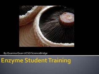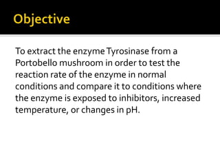 The document summarizes an experiment to test the reaction rate of the enzyme tyrosinase under different conditions. Tyrosinase is extracted from portobello mushrooms and its reaction with L-DOPA is tested under normal conditions and compared to when exposed to inhibitors, increased temperature, or changes in pH. The experiment involves extracting the enzyme, performing a control reaction, and then experimental reactions under different pH levels, inhibitors, or temperatures to see how these factors affect the reaction rate of tyrosinase.