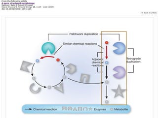 This document discusses two main theories for how enzyme systems evolved: retrograde evolution and patchwork evolution. Retrograde evolution proposes that pathways evolve backwards, with newer reactions preceding existing ones. Patchwork evolution suggests that enzymes initially had broad specificities and specialized over time through gene duplication. While some evidence supports retrograde evolution, more data favors patchwork evolution. However, the CS2 hydrolase enzyme appears to be an exception, as its structure and function indicate it did not evolve but was purposefully designed. In conclusion, the theories of enzyme evolution are still being refined as exceptions are discovered.