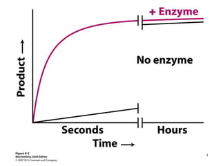 Enzymen veranderen reactie-snelheid maar niet het evenwicht. S P K = [P]/[S]= k f /k r = 100. De evenwichtsconcentratie van P is een factor 100 groter dan van S. Door een enzym wordt evenwicht eerder bereikt, maar verschuift niet. 10 -6 s -1 10 -4 s -1