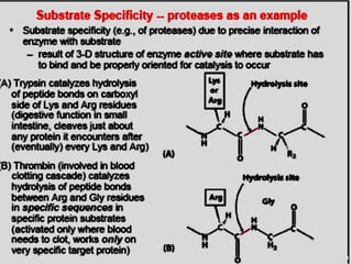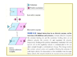 The document discusses enzymes as essential biocatalysts for biochemical reactions, emphasizing their roles in life processes, specificity, catalytic efficiency, and regulation. It covers enzyme structure, classification, and kinetics, including the Michaelis-Menten model, factors affecting reaction velocity, inhibition types, and regulatory mechanisms. Enzymes are vital to biological functions and are affected by various conditions such as substrate concentration, temperature, and pH.