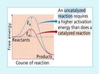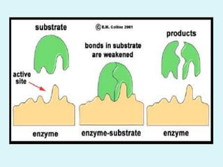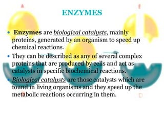 Enzymes are biological catalysts that speed up chemical reactions in living organisms. They are usually proteins that lower the activation energy of reactions and bring substrates together in the correct orientation. Enzymes work through specific active sites and are not consumed by reactions. They are affected by factors like temperature, pH, and substrate concentration. The lock and key and induced fit models describe how enzymes specifically interact with substrates. Enzymes have many uses in industries like food processing, brewing, paper production, and detergents.