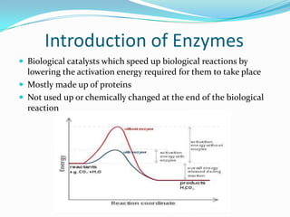 Enzymes are biological catalysts that speed up biochemical reactions by lowering their activation energy. They are mostly proteins and are not used up in the reactions they catalyze. Enzymes can catalyze both anabolic reactions that build up complex molecules and catabolic reactions that break down complex molecules. They are classified based on the type of reaction they catalyze such as hydrolases, oxidoreductases, transferases, lyases, isomerases, and ligases. Enzyme activity is affected by factors like temperature, pH, and substrate and enzyme concentrations, with most enzymes having an optimal temperature and pH at which their activity is highest before they become irreversibly denatured.