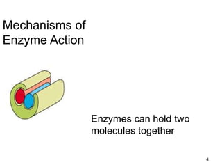 Enzymes catalyze biochemical reactions and lower their activation energy. They do this by holding molecules together, moving electrons between them, and physically manipulating their structures. Enzymes control reaction rates by forming enzyme-substrate complexes at each step. Kinetic studies examine how factors like temperature, concentrations, and effectors influence reaction rates. The Michaelis-Menten model describes how enzyme velocity increases with substrate concentration until plateauing at maximum velocity. Key parameters are KM, the substrate concentration at half-maximal velocity, and kcat, the enzyme's turnover number. Enzyme inhibitors are used as drugs and studied to understand regulation.