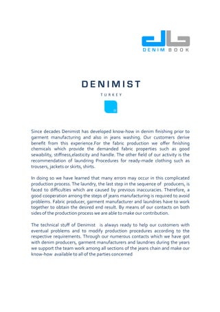 Denimist specializes in denim finishing and jeans washing, offering finishing chemicals and laundry recommendations to achieve desired fabric properties and avoid production errors. Enzymes, specific biocatalysts, are highlighted for their roles in environmentally friendly textile processing, replacing hazardous chemicals and enhancing processes like desizing and denim finishing. The document discusses the advantages of enzyme usage in the textile industry, including improved efficiency, reduced environmental impact, and the ability to create a variety of finishes for denim garments.