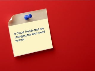 The document discusses the growing adoption of cloud computing and provides 9 cloud trends and tips for using cloud services safely. It notes that cloud computing is experiencing huge growth, with cloud revenue at $60 billion and that 70% of small businesses are aware of cloud services, with 25% currently using cloud and 45% planning to use cloud in the next year. It then outlines 9 cloud trends, including elastic cloud computing, datacenter marketplaces, virtual desktops, four screen solutions, cloud security, cloud-ready broadband, sales 2.0, machine learning, and business app stores. It concludes with tips to avoid potential issues in the cloud such as vendor lock-in, understanding vendor motivations, implementing security plans, investigating vendor reputation