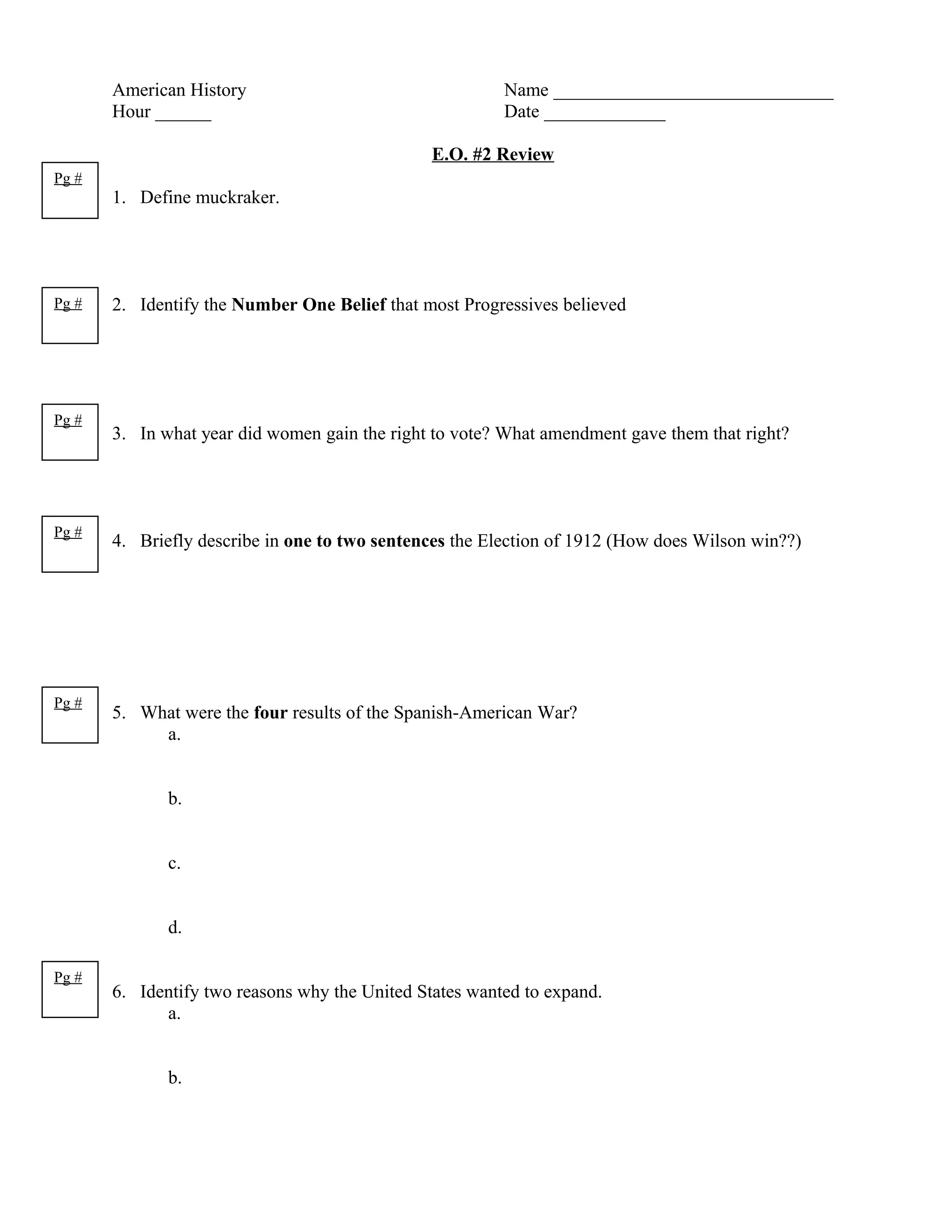 This document contains a review of key topics in American history from the Progressive Era and World War I period. It includes 14 multiple choice and short answer questions testing knowledge of muckrakers, women's suffrage, the 1912 election, outcomes of the Spanish-American War, US expansionism, nationalism, Roosevelt's "big stick" policy, the Panama Canal, US entry into WWI, the Open Door Policy, and the goals of the League of Nations. The student is to answer each question briefly and identify the relevant page numbers where the information could be found.