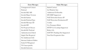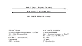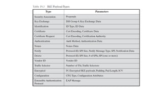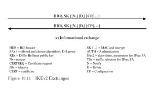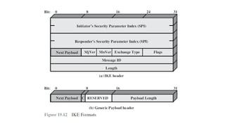 The document provides an overview of Internet Protocol Security (IPsec), detailing its architecture, operational modes (tunnel and transport), and applications for securing network communications across various scenarios, such as remote access and e-commerce. It explains the roles of authentication and confidentiality, the Internet Key Exchange (IKE) protocol for key management, and how Security Associations (SAs) and Security Policy Databases (SPDs) guide IPsec's functionality. Key benefits include transparency to applications and users while providing robust encryption and authentication to safeguard all IP-level traffic.