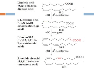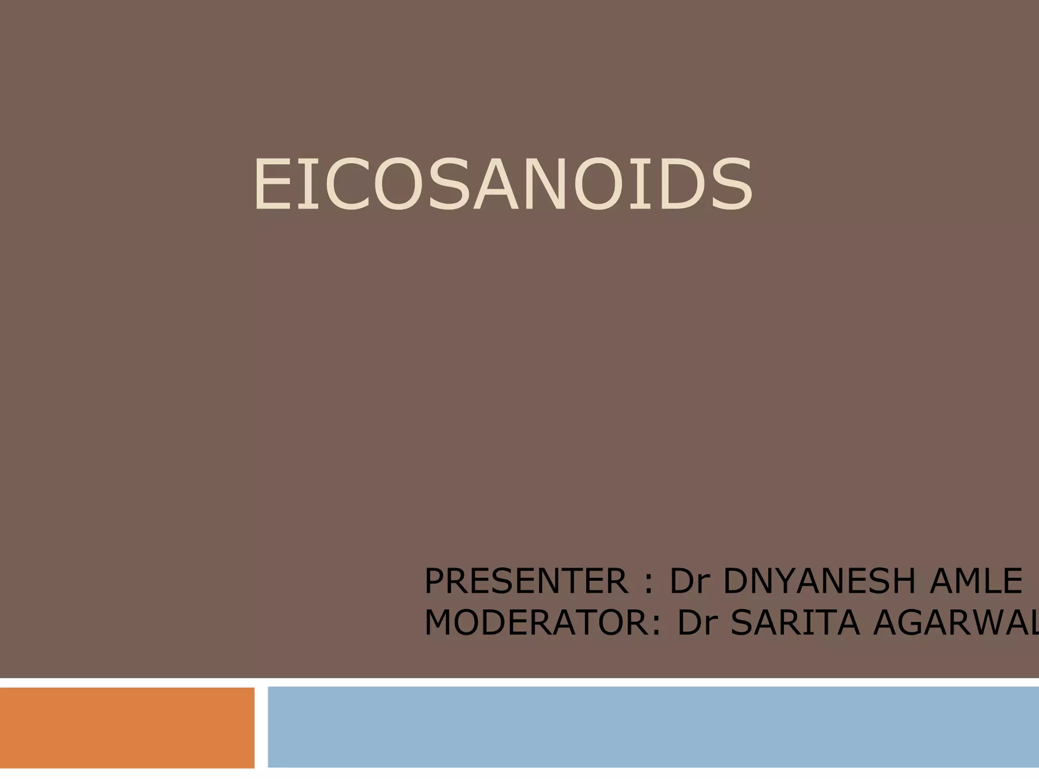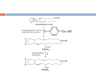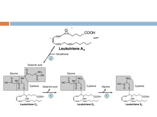 Eicosanoids are physiologically active substances derived from 20-carbon polyunsaturated fatty acids. They include prostaglandins, thromboxanes, leukotrienes, and others. Arachidonic acid is the most prevalent eicosanoid precursor in humans. Eicosanoids are produced by almost all mammalian cells and act as local messengers. They have diverse roles including inflammation, smooth muscle contraction, platelet aggregation, and reproductive functions. Nonsteroidal anti-inflammatory drugs inhibit eicosanoid production.