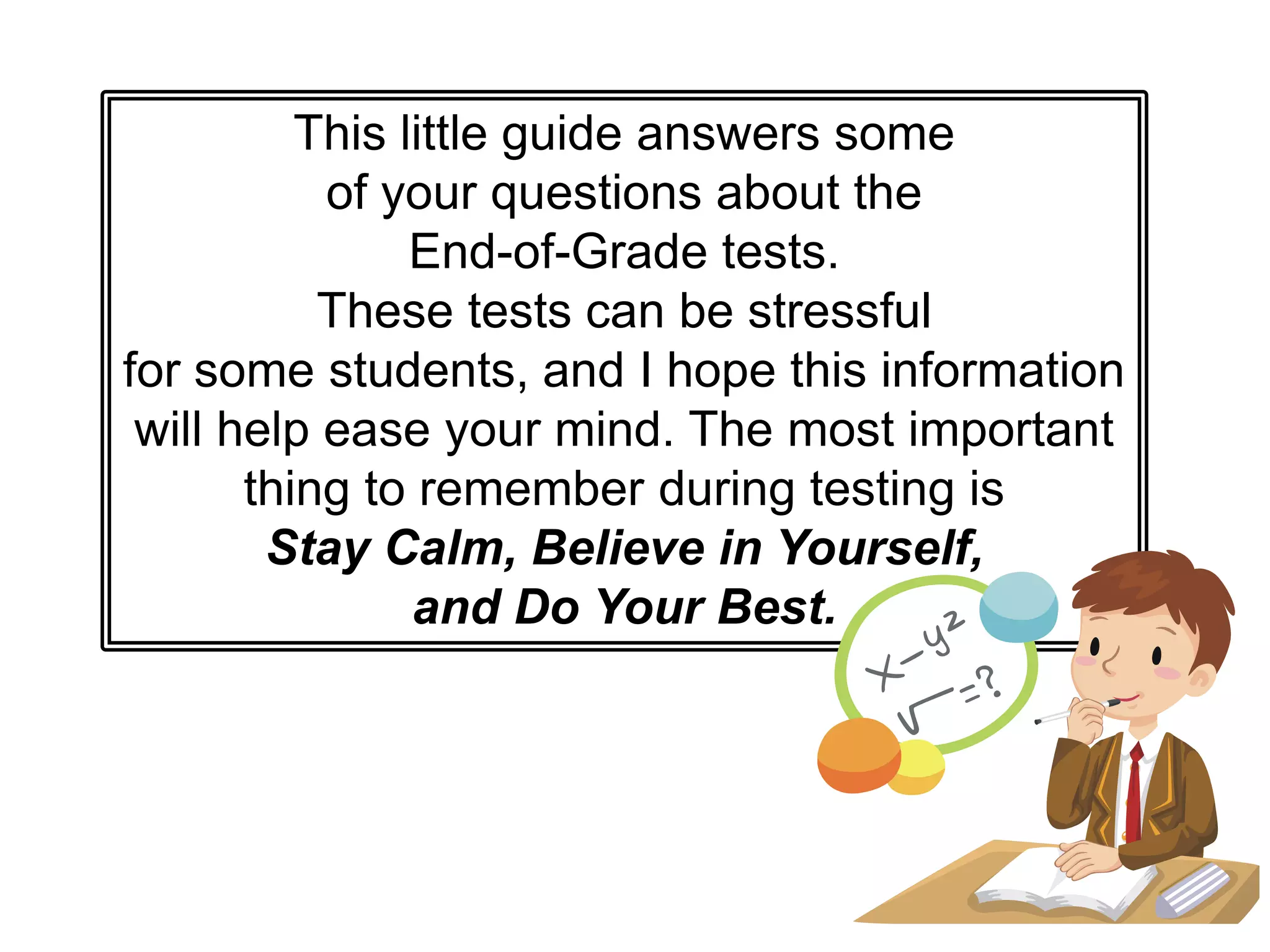 This document provides guidance and advice to ease students' worries about taking their End-of-Grade tests (EOGs). It addresses common concerns like what happens if a student doesn't pass, details about the test format and schedule, and suggestions for dealing with issues during the test like running out of time or needing to use the bathroom. The overarching message is that teachers, proctors, and the testing environment are all set up to help students feel comfortable and supported so they can do their best.