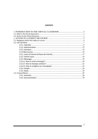 The document is a student’s guide for accessing and navigating the EOI Virtual Training Platform, utilizing the Moodle system. It covers various aspects of the virtual classroom, including access to courses, navigation, communication tools, and resources. Detailed instructions are provided on how to use features such as calendars, messaging, and forums for successful online learning.