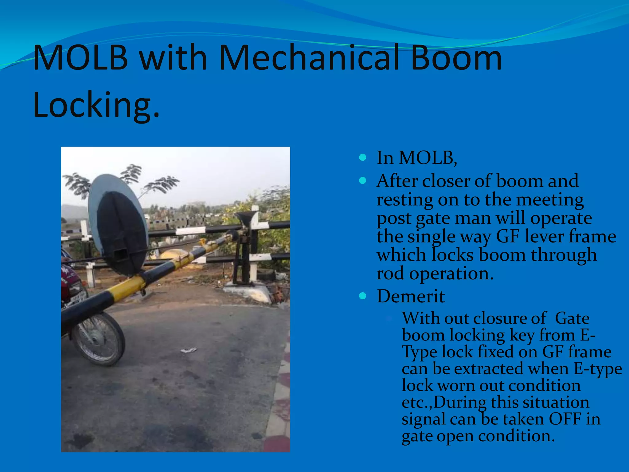 The document discusses improvements to electric operated level crossing (EOLB) gate locking mechanisms. It describes issues with existing solenoid locking mechanisms such as frequent failures and gate close indications being disturbed. A proposed mechanical boom locking mechanism is then described which involves a rack and pinion lever to lock the booms after closure, preventing the signal from being lowered unless the key is extracted after proper closure. This new design aims to eliminate issues with existing solenoid locks and ensure positive boom locking.