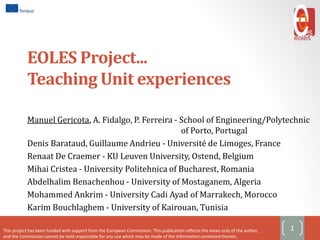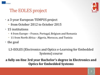 The Eoles project is a three-year European Tempus initiative aimed at developing a fully online Bachelor's degree in Electronics and Optics for embedded systems, involving 15 institutions from Europe and North Africa. The course includes 14 technical units covering fundamental and applied sciences, complemented by soft skills, with asynchronous lectures and virtual remote labs for practical experience. The program was accredited by multiple national educational authorities and has successfully enrolled students, delivering a joint diploma recognized across the European higher education area.