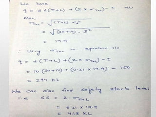- Formulas show how to calculate order quantity factoring in demand, lead time variability, safety stock level, and other variables.
