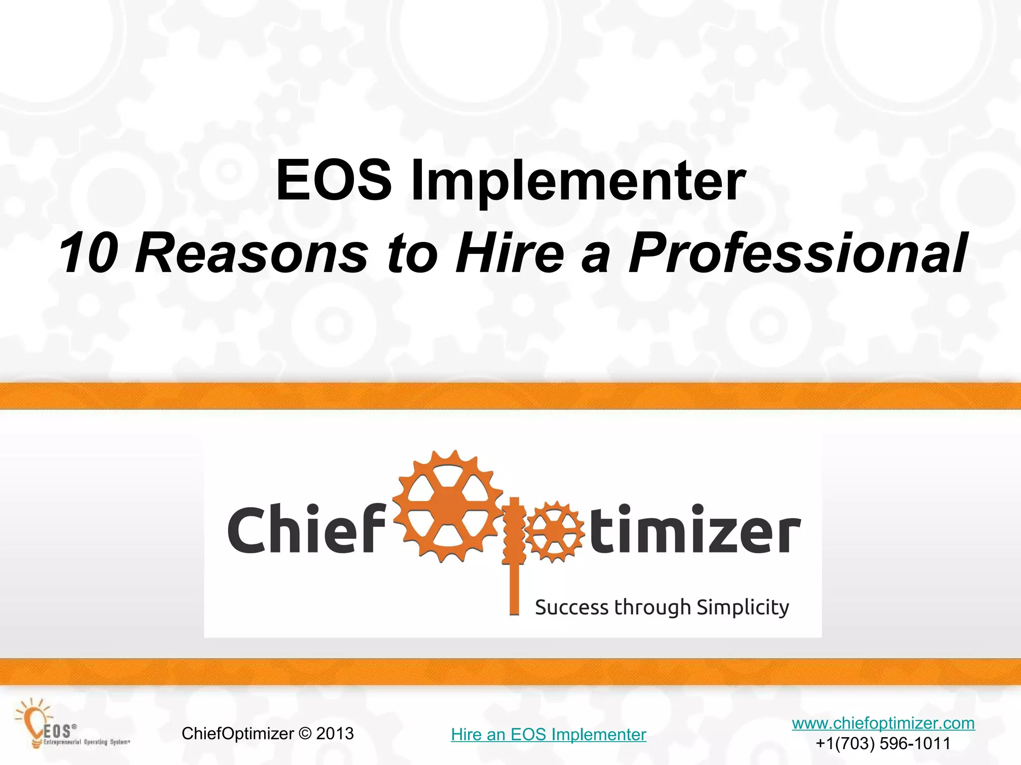 The document introduces the Entrepreneurial Operating System (EOS), a framework designed to help businesses achieve systematic growth and overcome obstacles. It highlights 10 reasons to hire a professional EOS implementer, emphasizing benefits like objectivity, accountability, and capacity building. Additionally, Jonathan B. Smith, a certified EOS implementer, offers free introductory meetings to assist businesses in aligning their teams and achieving their goals.