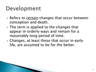 Development refers to the changes that occur between conception and death, especially those that are orderly and remain for a reasonably long period. These changes result in behavior that is more organized, effective, and complex. Development can be divided into physical, personal, social, and cognitive aspects. It involves changes that occur naturally through maturation and genetic programming, as well as changes brought about through environmental interaction and learning. Modern developmental psychologists believe that both nature and nurture influence development, with biological factors playing a stronger role in some aspects like physical development and environmental factors more influential for other areas such as moral development. Development generally follows predictable stages and later changes build upon earlier ones, though rates and sequences can vary between individuals.