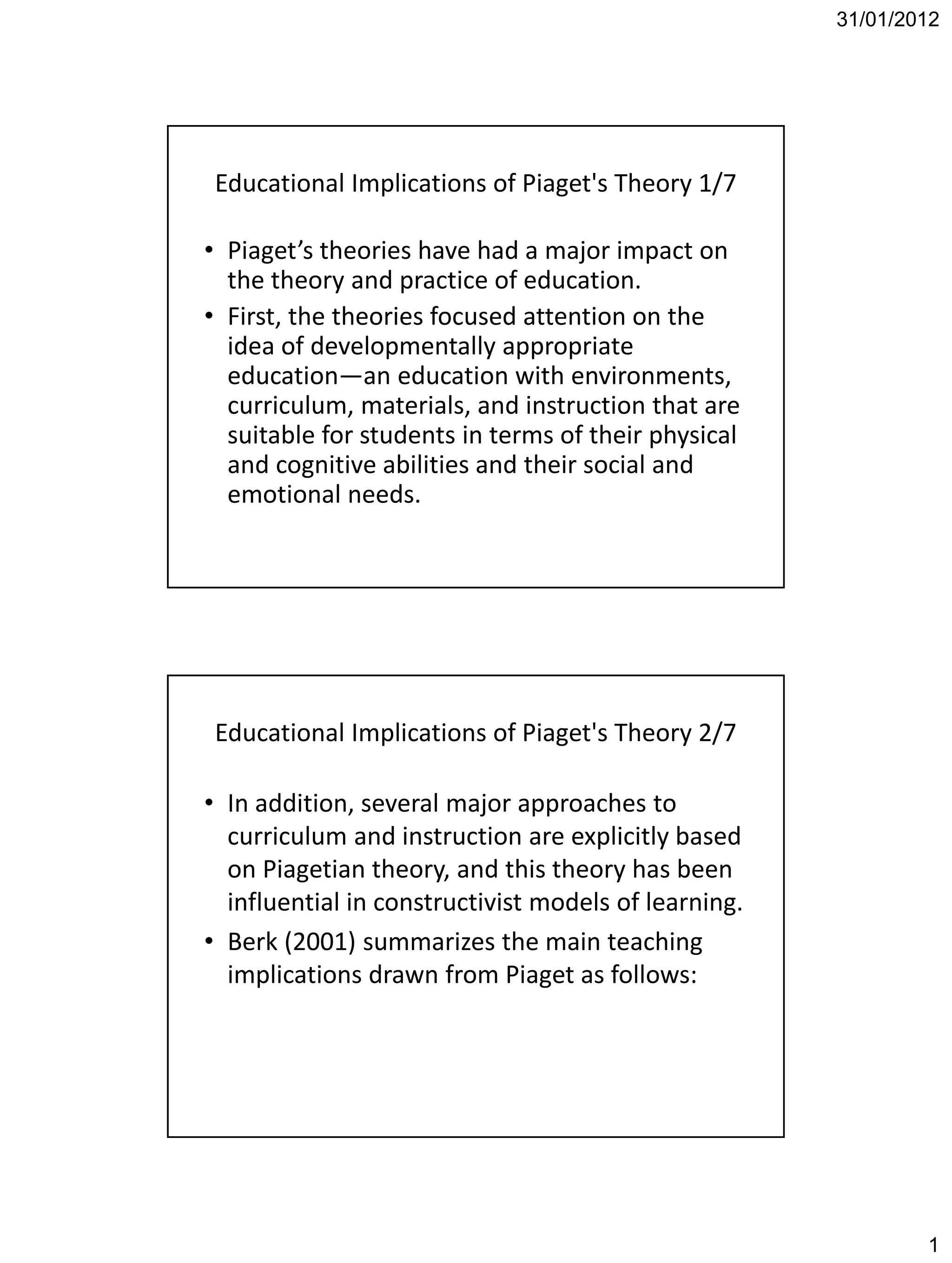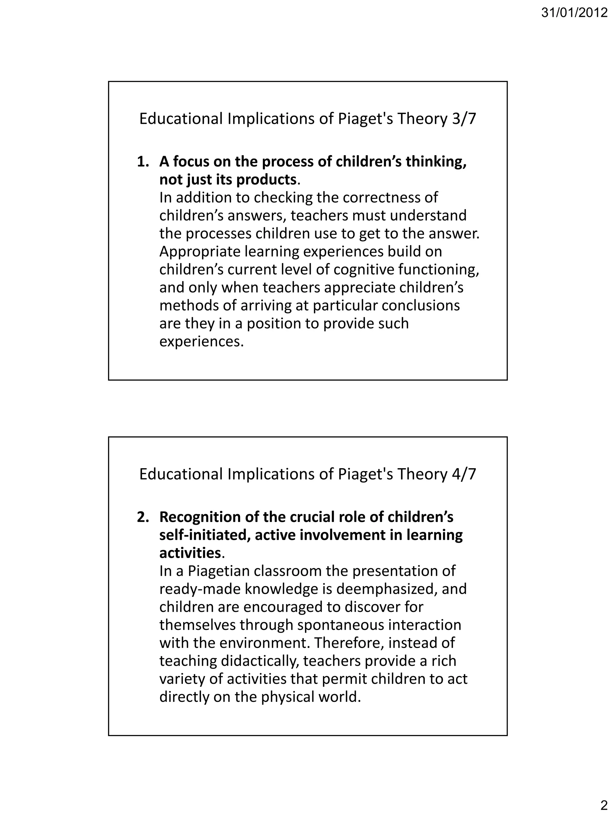 Piaget's theory of cognitive development had major implications for education. It emphasized developing curriculum and instruction appropriate for students' cognitive abilities. It also focused on understanding how students think rather than just answers, encouraging active and self-directed learning over direct teaching, and accepting individual differences in pace of development. However, the theory had limitations as some of Piaget's conclusions underestimated children's capabilities and overestimated the influence of biological factors over environment and education on cognitive development.