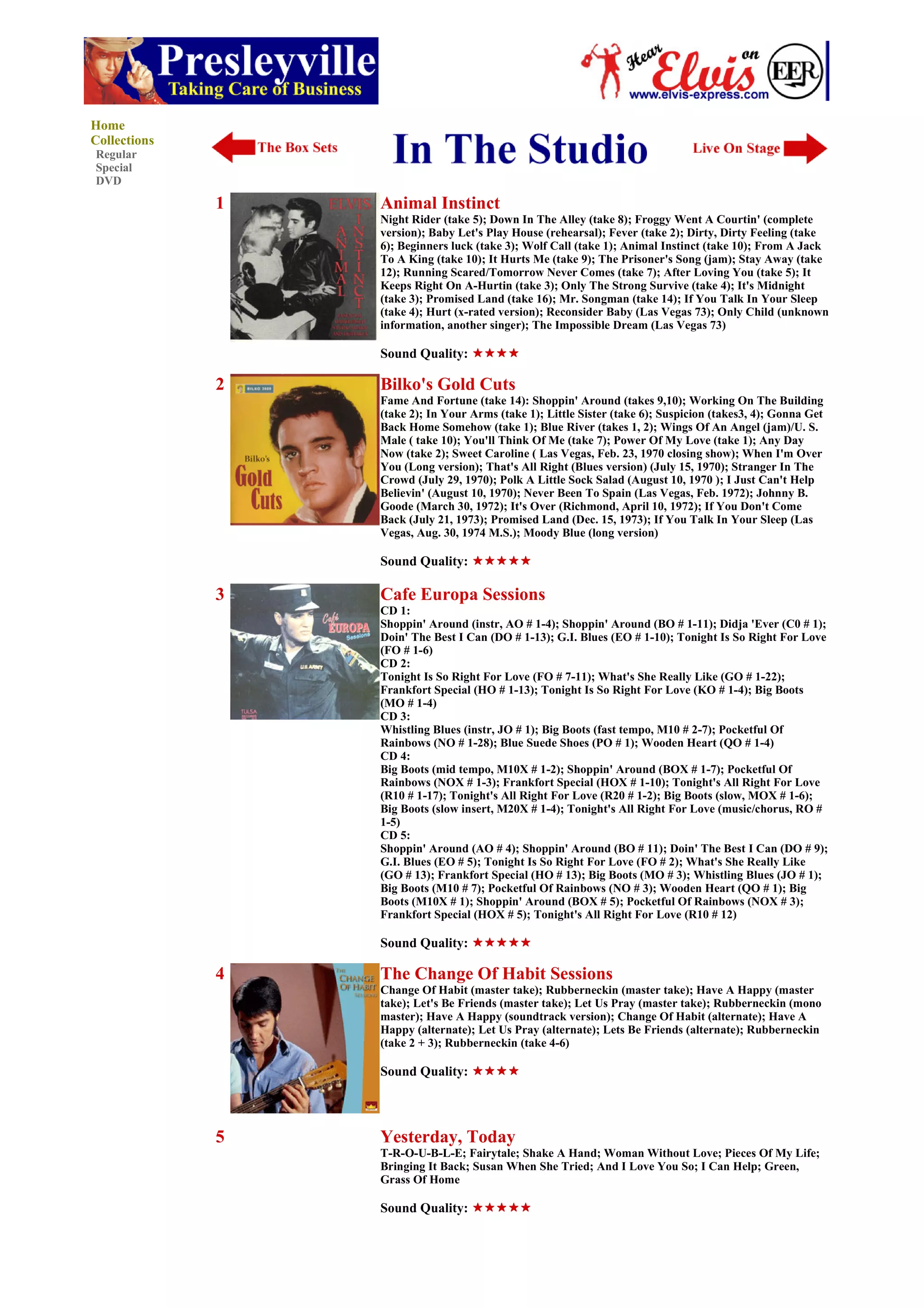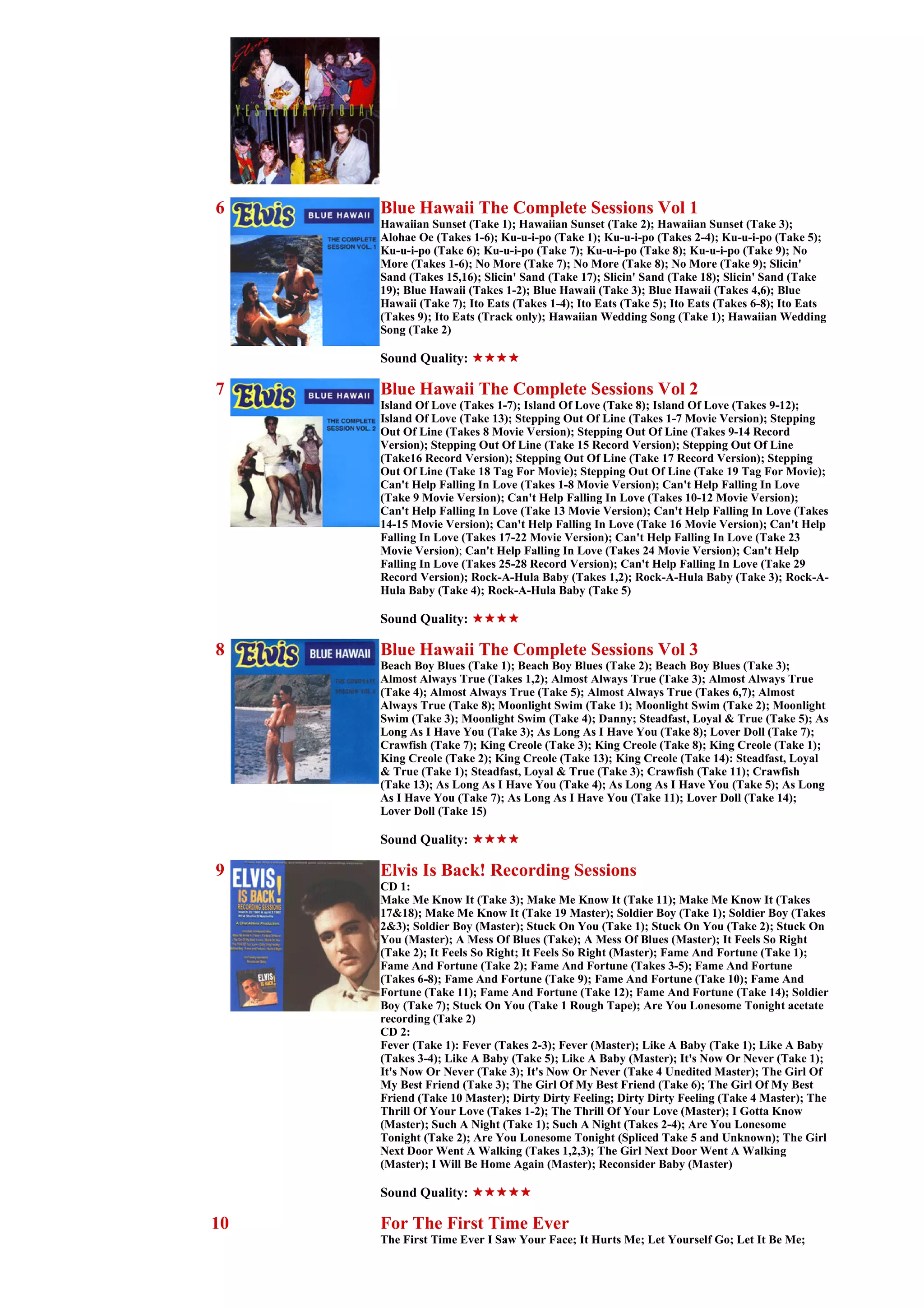 This document provides a list of 20 albums in Elvis Presley's catalog. Each album is numbered and includes a title and brief description of the album contents, as well as a note on sound quality. The albums cover different stages of Elvis' career and include live performances, studio outtakes, and complete recording sessions.
