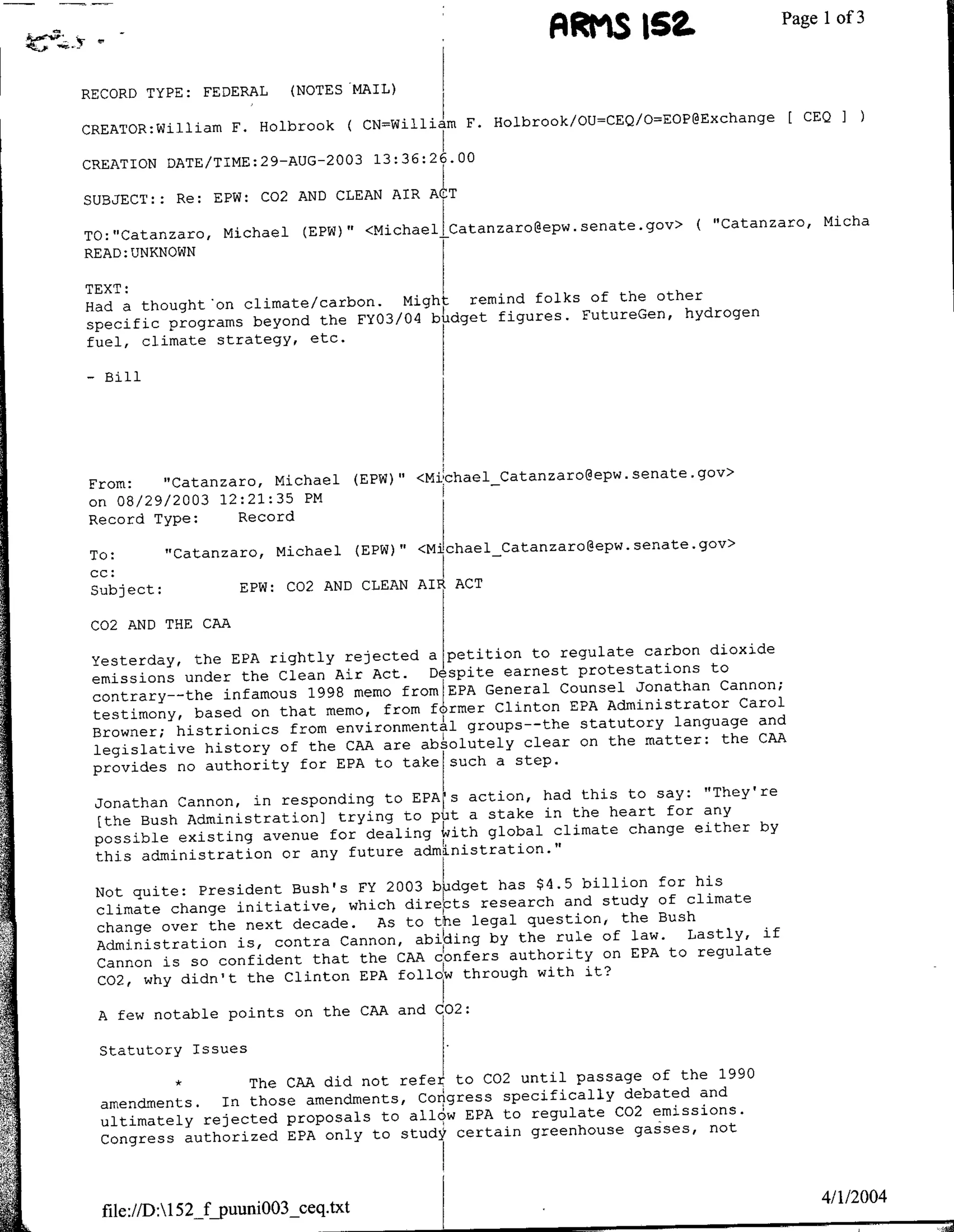2) While some argued the CAA provides authority to regulate CO2, the Bush Administration budget includes $4.5 billion for climate change initiatives and abides by the rule of law in not regulating under the CAA.