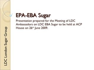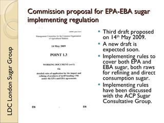 This document summarizes a presentation for LDCs on the EU's proposed rules for implementing EPA-EBA preferential sugar imports. It outlines key aspects of the draft regulation including import/export licensing procedures, management of the transitional safeguard mechanism for non-LDC sugar, rules for full-time sugar refiners, and requirements to pay the EPA-EBA minimum sugar price. Details are provided on information sharing between the EU and exporting countries regarding sugar production, trade, and consumption.
