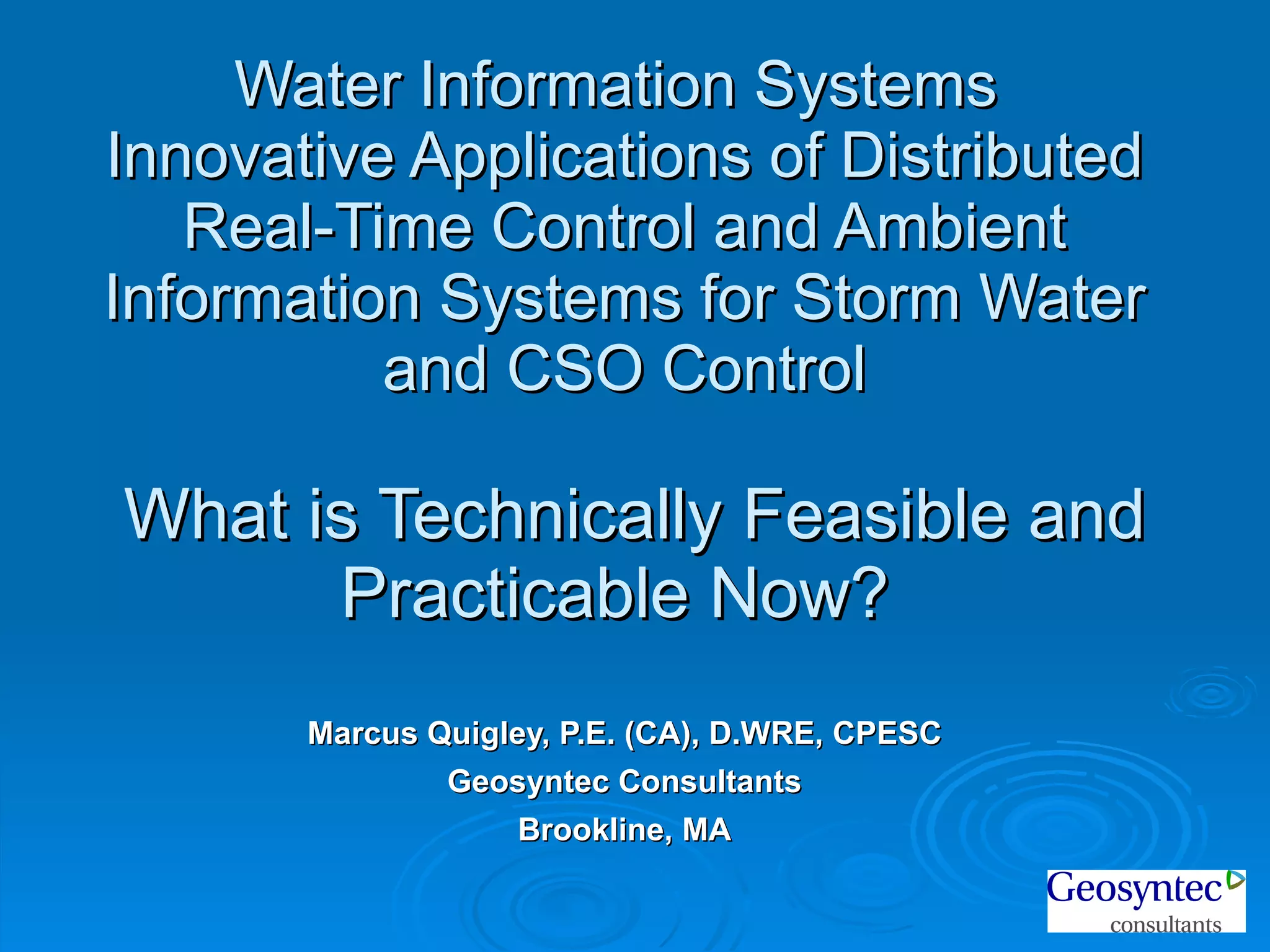 This document discusses innovative applications of water information systems for stormwater and combined sewer overflow (CSO) control, highlighting the significance of real-time control and ambient information systems. It emphasizes the potential for both passive and dynamic intelligent controls to integrate technology for effective urban water management. The findings suggest advanced harvesting systems and ambient information services can significantly reduce stormwater impacts and optimize individual water usage while enhancing awareness of consumption and regulatory changes.