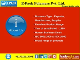E-Pack Polymers Pvt. Ltd., based in Greater Noida, India, is a manufacturer and exporter specializing in pre-engineered buildings (PEB), including industrial sheds, warehouses, and prefabricated office buildings. Established in 1989 and ISO certified, the company is known for its high-quality, durable, and environmentally friendly products that cater to various international markets. Their offerings feature quick installation, aesthetic designs, and resilience against adverse weather conditions.