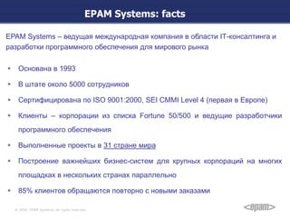 Документ представляет собой организационную структуру и основные факты о компании EPAM Systems в Украине, основанной в 1993 году и насчитывающей около 5000 сотрудников. Компания специализируется на IT-консалтинге и разработке программного обеспечения, обслуживая крупных клиентов из списка Fortune 50/500 в 31 стране. Также описываются условия работы, программы профессионального роста и корпоративные мероприятия для сотрудников.