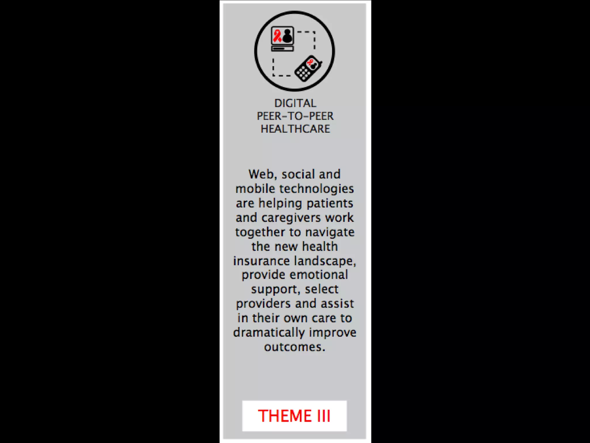 The presentation discusses the future of healthcare, highlighting three main themes: health hyperefficiency, personalized healthcare movement, and digital peer-to-peer healthcare. It identifies 15 trends related to these themes that are already influencing the healthcare landscape. The information is based on original interviews, curated research, and e-patient surveys conducted over a year.