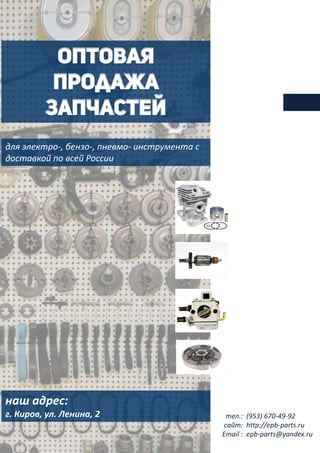 Компания занимается оптовой продажей запчастей для электро-, бензо-, пневмо-инструмента с доставкой по всей России, предлагая более 3500 позиций товаров и 100% гарантию качества. Обработка заказов осуществляется в течение одного часа, а отгрузка товара — за один день. Для клиентов доступны различные формы оплаты и бесплатная доставка при заказах от 100 000 рублей.