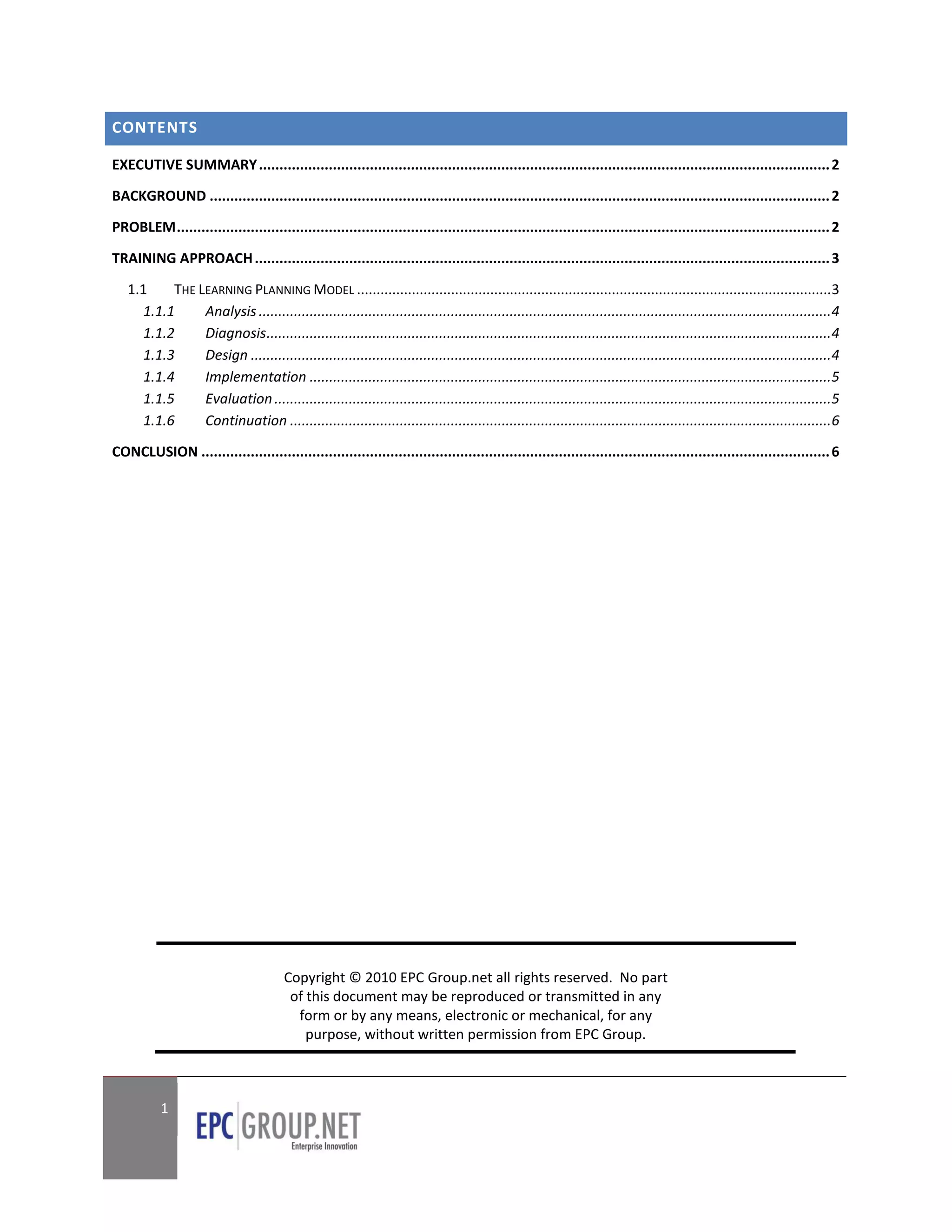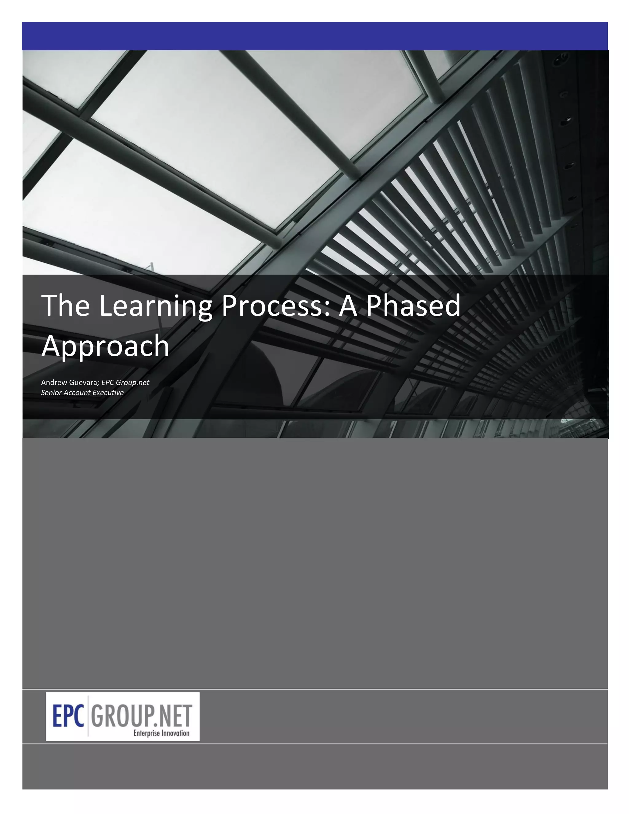 The document describes a phased learning process used by EPC Group to train a pharmaceutical company on how to use Axceler's ControlPoint software. The 6 phase process includes: 1) Analyzing the company's goals and needs, 2) Diagnosing existing skills and needed skills, 3) Designing the training content, 4) Implementing training through instruction and delivery, 5) Evaluating the training impact, and 6) Continuing the learning process. EPC Group used this process to address the various questions the pharmaceutical company had about ControlPoint's functions and controls.