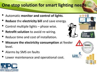 The document outlines an innovative smart control system for street lighting, known as the lit-green concept, designed to automate the monitoring and management of street lights. It highlights features including energy savings, remote accessibility, fault detection, and the ability to retrofit existing systems without extensive rewiring. The system also utilizes a wireless mesh network for extensive coverage and provides a cloud-based interface for real-time data and management.