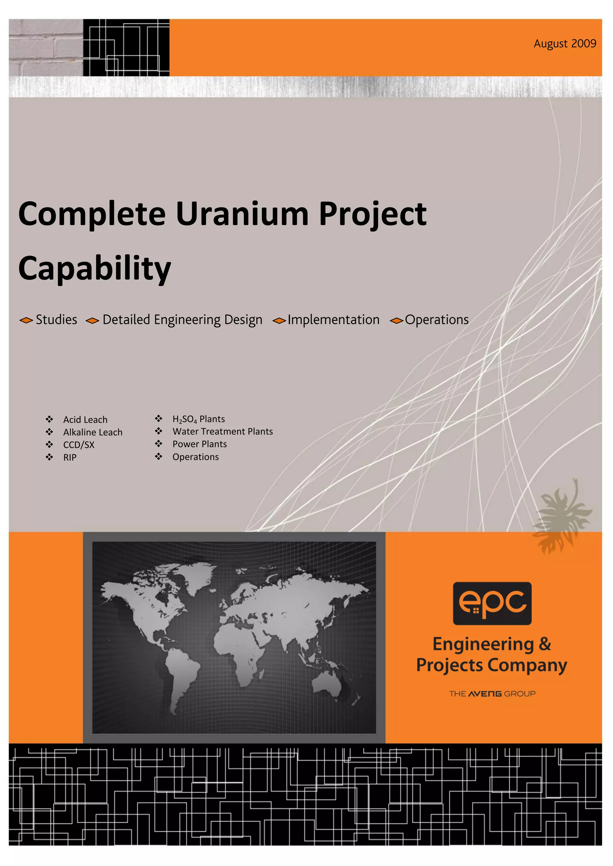 E+PC Engineering & Projects Company Limited is a South African engineering firm specializing in mining and industrial projects. It has extensive experience in all aspects of uranium projects, from feasibility studies through detailed design, implementation, and operations. Recent uranium projects it has worked on include the Kayelekera project in Malawi and expansions at Langer Heinrich in Namibia. E+PC also has experience with related infrastructure like sulfuric acid plants and water treatment facilities.