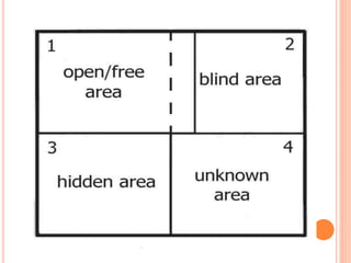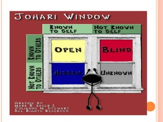 Dokumen ini membahas konsep diri dan Johari Window. Konsep diri adalah gambaran tentang diri sendiri yang terbentuk dari pandangan diri dan orang lain. Johari Window membagi informasi tentang diri menjadi empat kuadran (terbuka, tersembunyi, buta, tak diketahui) untuk memahami diri dan hubungan dengan orang lain. Tujuh jenis kecerdasan juga dibahas.
