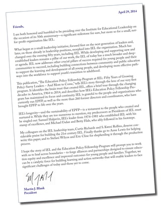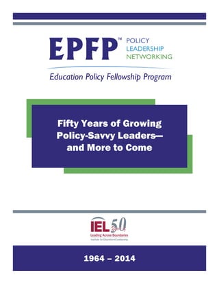 This document provides an overview of the 50-year history of the Institute for Educational Leadership's Education Policy Fellowship Program (EPFP). It began in 1964 as the Washington Internships in Education (WIE) with funding from the Ford Foundation to develop education policy leaders. Over the years it has expanded to include state-based programs and now has over 8,000 alumni. The program provides year-long fellowships for emerging leaders to learn about the education policy process. It aims to develop non-partisan, collaborative leaders who can work across boundaries. While the policy issues and participants have changed over time, the goal of building leadership skills through the program has remained consistent.