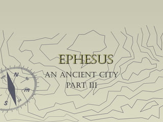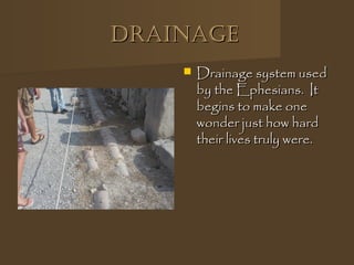 This document provides information about the ancient city of Ephesus through descriptions of various archaeological finds and structures. It discusses the city's drainage system, theatre used by the city council, ongoing excavations that have uncovered wealthy homes and only about half of the city so far. Other topics covered include the library built by Emperor Celsius that held 12,000 scrolls, public latrines similar to those found at Hadrian's Wall, St. John's Church which is believed to be the burial place of St. John the Apostle, and the Temple of Artemis, one of the Seven Wonders of the Ancient World, located near the city and dedicated to the goddess Artemis.