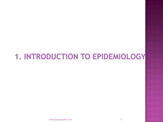 Epidemiology is defined as the study of the distribution and patterns of health-related events, characteristics, and causes in defined populations. It identifies risk factors for disease and informs public health policy and evidence-based medicine. The ultimate goal of epidemiology is the prevention of disease and promotion of health through elucidating the natural history of diseases, describing population health status, and establishing disease determinants and intervention effectiveness.