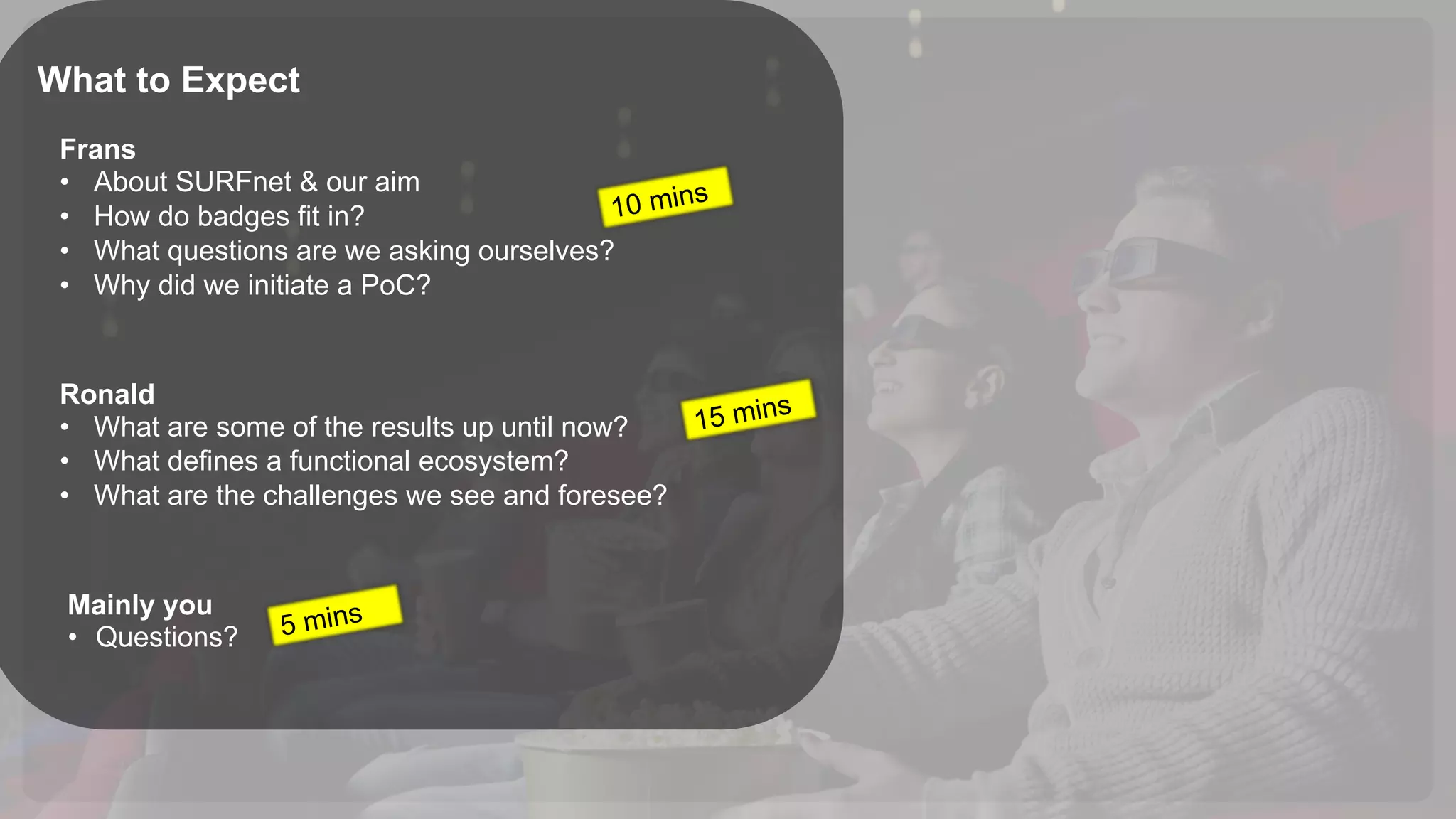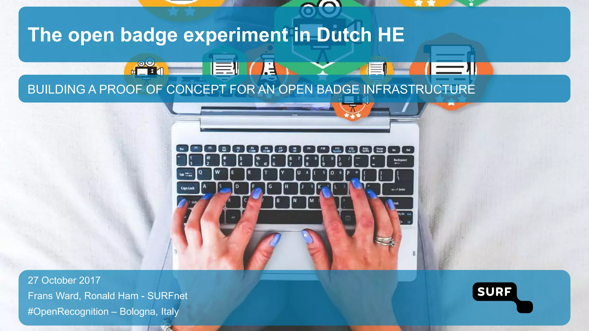 The document discusses a proof of concept for an open badge infrastructure initiated by SURFnet to enhance micro-credentialing in Dutch education. It outlines the goals, processes, and challenges associated with implementing digital badges as a means to recognize skills, facilitate flexible education, and improve communication of competencies to employers. Emphasis is placed on building a functional ecosystem that supports integration with educational systems and the needs of students and institutions.