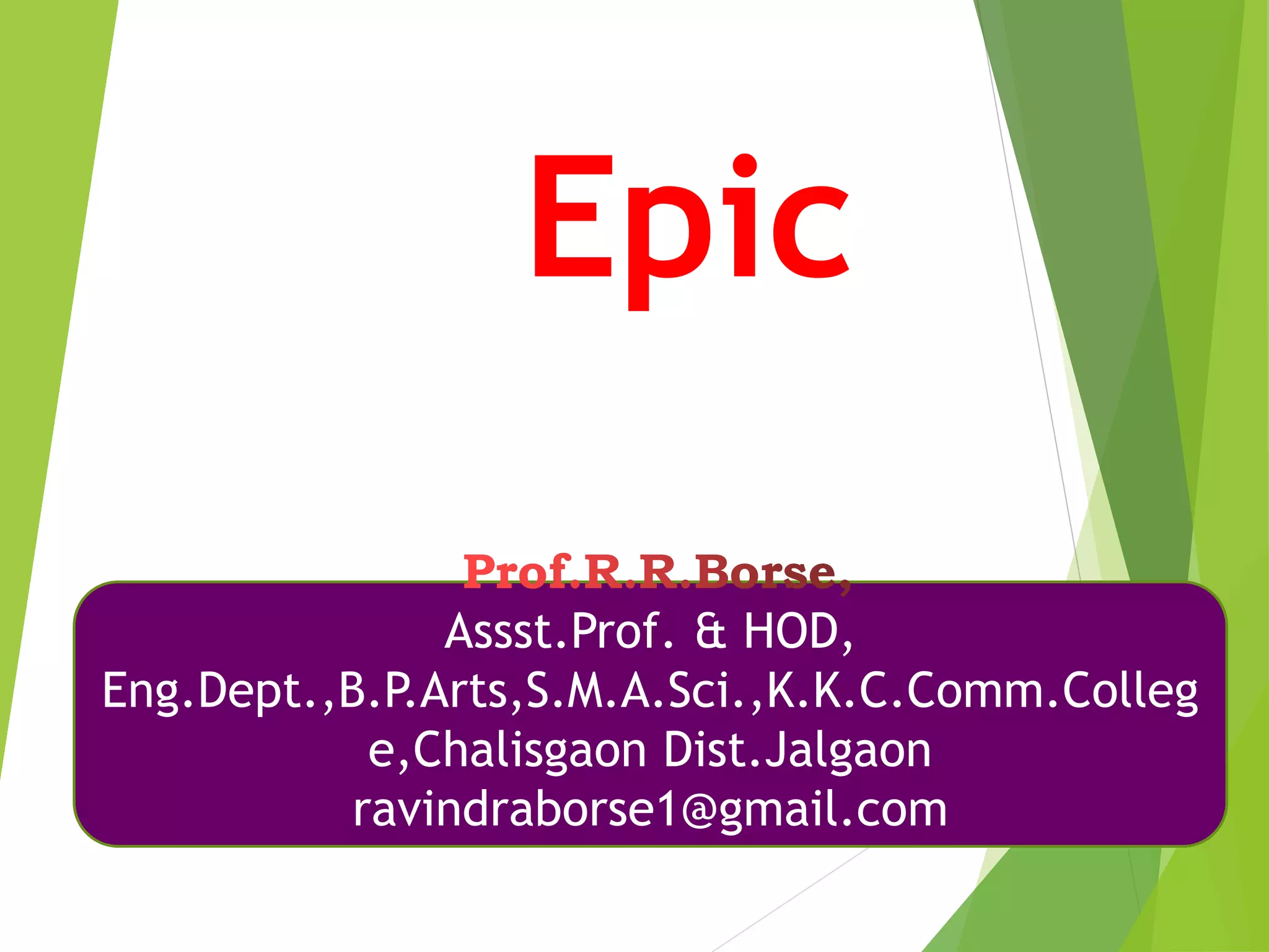 This document defines and discusses the characteristics of epic literature. It provides examples of famous epics from around the world, including the Epic of Gilgamesh, the Mahabharata, the Odyssey, Beowulf, and Dante's Divine Comedy. The document notes that epics typically begin in medias res, cover vast settings, include invocations to muses and statements of themes, and feature heroes that embody societal values. Examples of excerpts from Lord Byron's Don Juan and Dante's Divine Comedy are also provided. The document concludes with brief discussions of Greek epic literature and different types of epics.