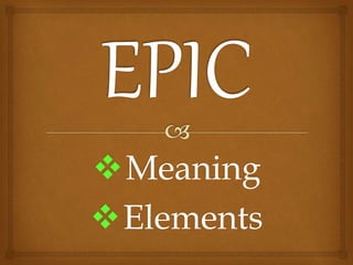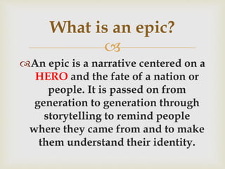 An epic is a narrative poem centered around a heroic figure and their quest that is passed down orally between generations. The elements of an epic include feats of superhuman strength by heroes, supernatural forces, and spanning vast settings. Specifically, the Ibalon epic features three heroes - Baltog, Bantong, and Handyong - known for their superhuman strength as they battle giants and monsters across the varied landscape of Ibalon.