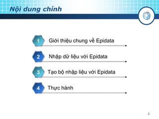 Tài liệu hướng dẫn sử dụng phần mềm EpiData 3.1, cung cấp cách nhập và quản lý dữ liệu cho các nghiên cứu y tế công cộng và y học dự phòng. EpiData là phần mềm miễn phí, dễ sử dụng với giao diện thân thiện, hỗ trợ xuất dữ liệu sang nhiều định dạng khác nhau. Hướng dẫn bao gồm các bước cài đặt, thiết kế form nhập dữ liệu, và quản lý bản ghi.