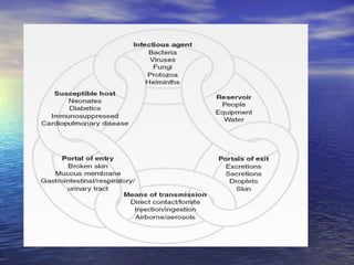 This document discusses the epidemic process and characteristics of infectious diseases. It defines the epidemic process as the rise and spread of infectious diseases among people. Infectious diseases are caused by the interaction between an infectious agent and susceptible host. They have an incubation period and cause immunity after infection in most cases. The document outlines the components of the epidemic process including infectious agents, transmission factors, and susceptible hosts. It also describes characteristics of infectious agents such as infectivity, pathogenicity, and virulence. Carriers are defined as those who spread infectious organisms without showing symptoms. The classification of diseases as acute, chronic, or subacute is also explained.