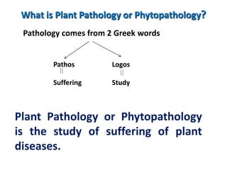 Plant pathology, or phytopathology, is the study of plant diseases, focusing on their causes, interactions with pathogens, and development mechanisms to create management strategies. Diseases are classified as endemic, epidemic, pandemic, or sporadic, with epidemics being sudden outbreaks causing significant damage. Understanding disease cycles and the factors influencing epidemics is essential for effective disease management in agriculture.