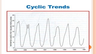 Epidemiology is defined as the study of the distribution and determinants of health-related states or events in populations and the application of this study to control health problems. It involves descriptive studies that ask questions about disease occurrence, magnitude, location, time period, and affected individuals. Analytical studies like case-control and cohort studies are used to test hypotheses about disease causes. Randomized controlled trials experimentally study interventions by applying or withdrawing suspected causes between study groups.