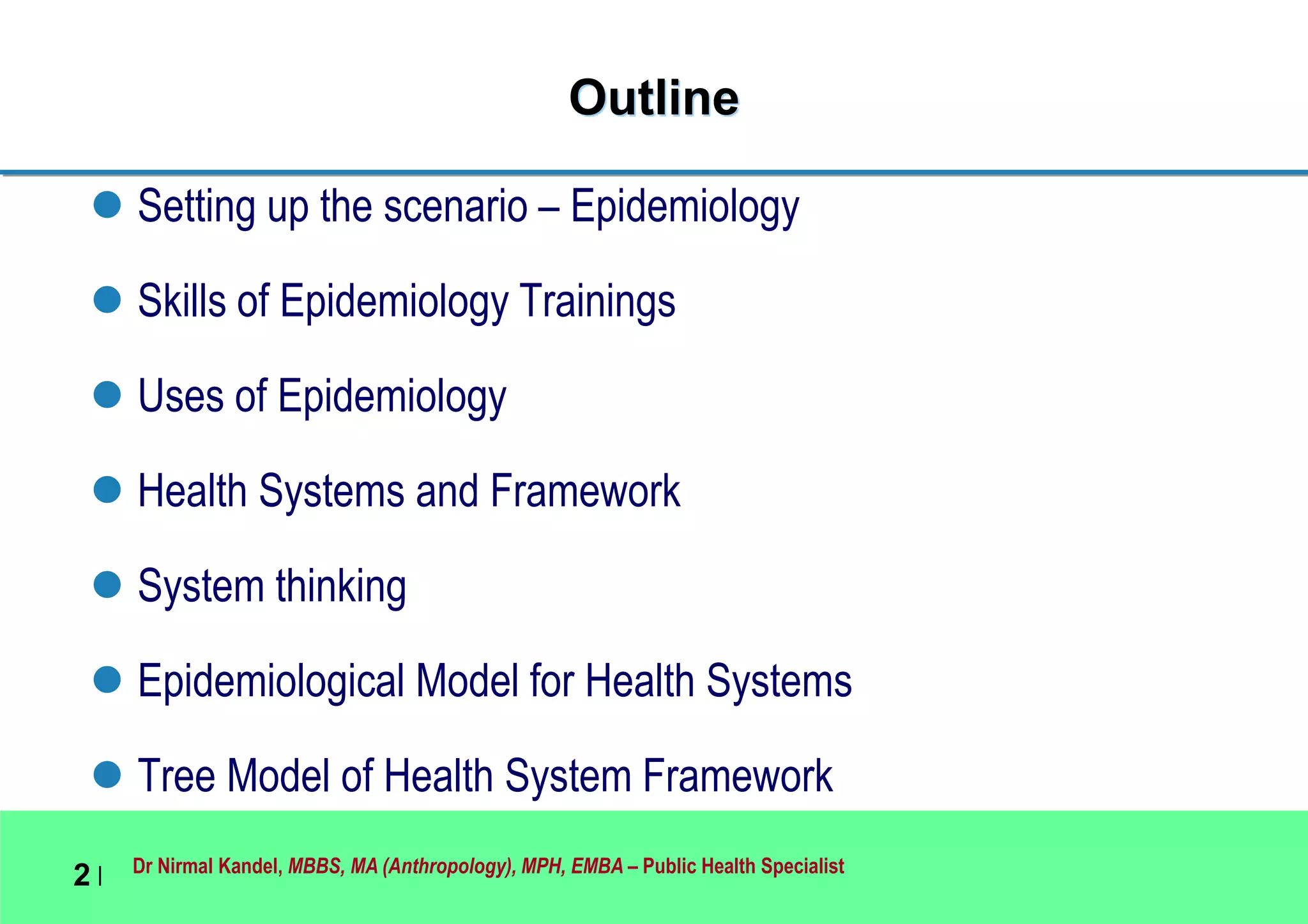 This document outlines Dr. Nirmal Kandel's presentation on epidemiology and health systems at the 2nd National Scientific Conference on Epidemiology in Bandung, Indonesia. The presentation covers definitions of epidemiology, skills gained through epidemiology training, current uses of epidemiology, applying epidemiology to health system development, and developing an epidemiological model for health systems. Dr. Kandel emphasizes using epidemiology to understand population health needs and inform how different components of health systems, such as workforce, finance, and information, should function based on those needs.