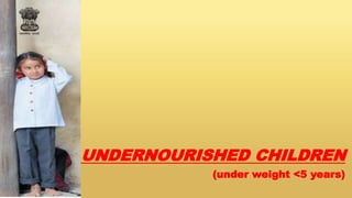 Undernutrition among children under 5 years old remains a major global public health problem. In India, approximately one third of children are underweight. The Integrated Child Development Services program aims to address undernutrition through nutrition supplementation, health services, and preschool education, though it has had limited effectiveness. Improving implementation by increasing focus on the first 1000 days of life, strengthening nutrition education, improving coordination between frontline workers, and enhancing community participation could help reduce undernutrition. Addressing its multidimensional causes requires commitment across health, nutrition, education, agriculture, and social welfare programs.