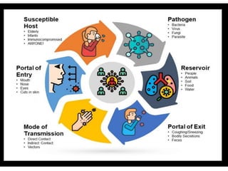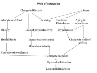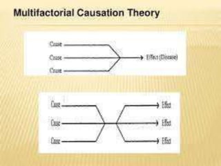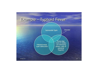 This document provides an introduction to epidemiology. It defines epidemiology as the study of disease patterns in human populations and the factors that influence health. It discusses key epidemiological terms like reservoirs, modes of transmission, incidence, prevalence, and the epidemiological triad model of disease causation. The objectives and uses of epidemiology are described, including identifying disease determinants, planning health programs, and evaluating effectiveness. Important epidemiological concepts like endemic, pandemic, epidemic, carriers, and outbreaks are also defined.