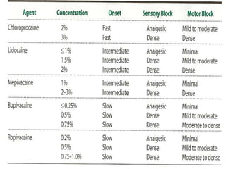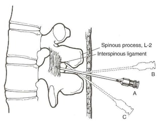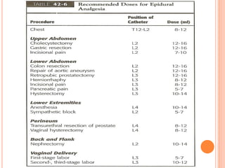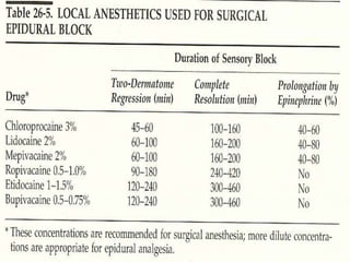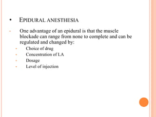 - Factors affecting the level and spread of an epidural block include injection site, dose, volume, concentration, position, age, and speed of injection. Increasing dose and volume increases spread, while concentration mostly affects density.